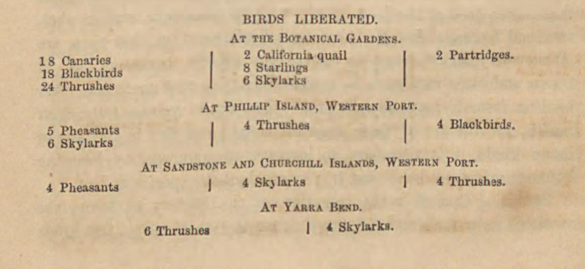 Birds liberated, from The First Annual report of the Acclimatisation Society of Victoria, 1862. Contributed to