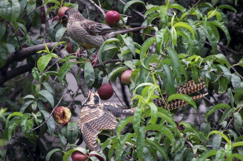 Unlike earlier birds, this one often perched in plain view. Then, although feeding itself on plums in a neighbour’s yard, constantly calling, I finally saw a Wattlebird come down and feed it. There were three Wattlebirds in the same area.