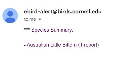 | Next by Thread: | For beginner bird watchers, about the names issue, Geoffrey Dabb via Canberrabirds [canberrabirds-bounces@lists.canberrabirds.org.au] |